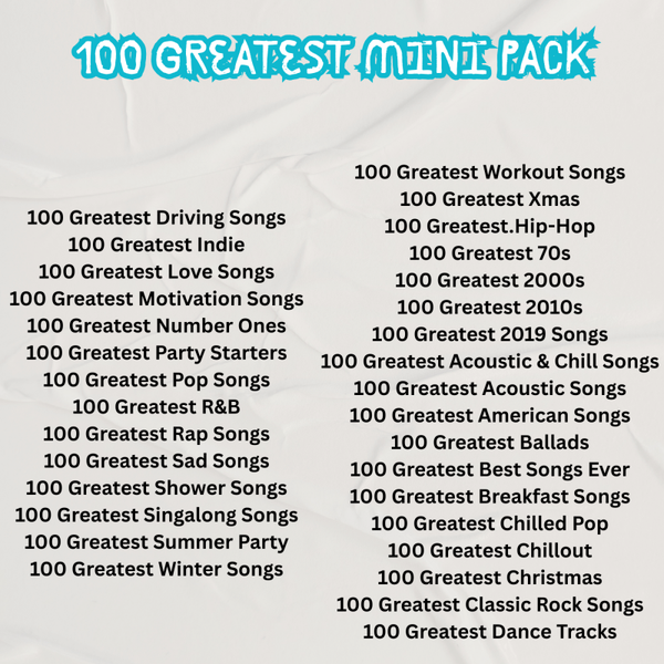 100 Greatest Driving Songs • 100 Greatest Love Songs • 100 Greatest Party Starters • 100 Greatest Pop Songs • 100 Greatest Rap Songs • 100 Greatest R&B • 100 Greatest Summer Party • 100 Greatest 70s • 100 Greatest 2000s • 100 Greatest Workout Songs • and more!